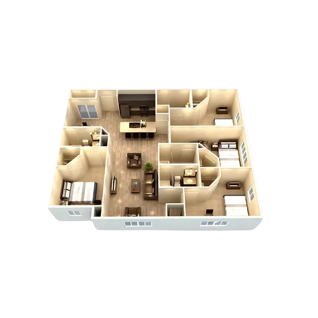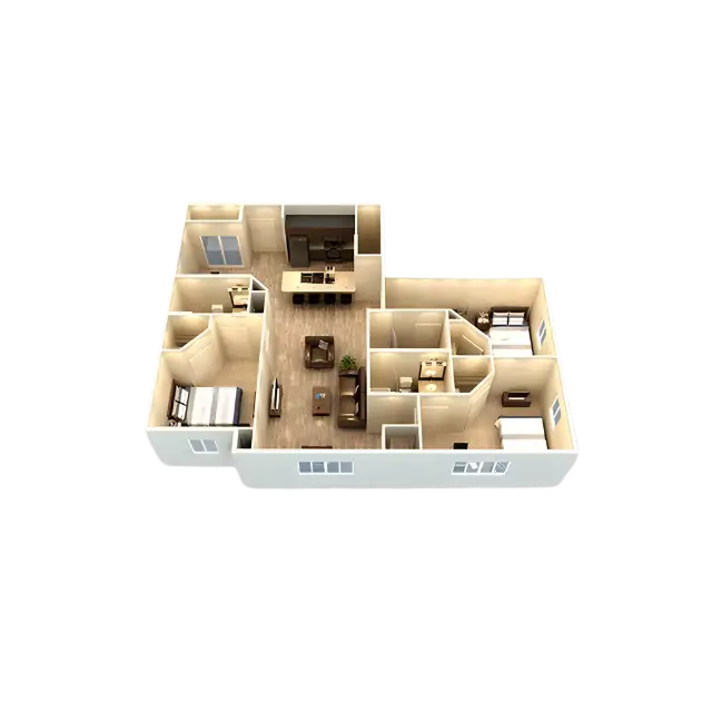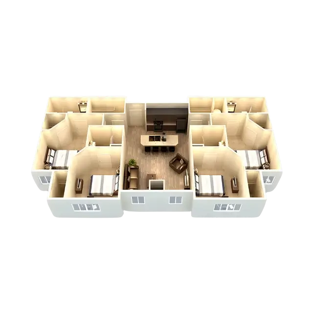 Each apartment includes private bedrooms with keyed entry and full bathrooms, furnished living areas with leather sofas, and modern kitchens with granite countertops and stainless appliances. Enjoy 9-foot ceilings, wood-style flooring, and in-unit washers and dryers for convenient, comfortable living.